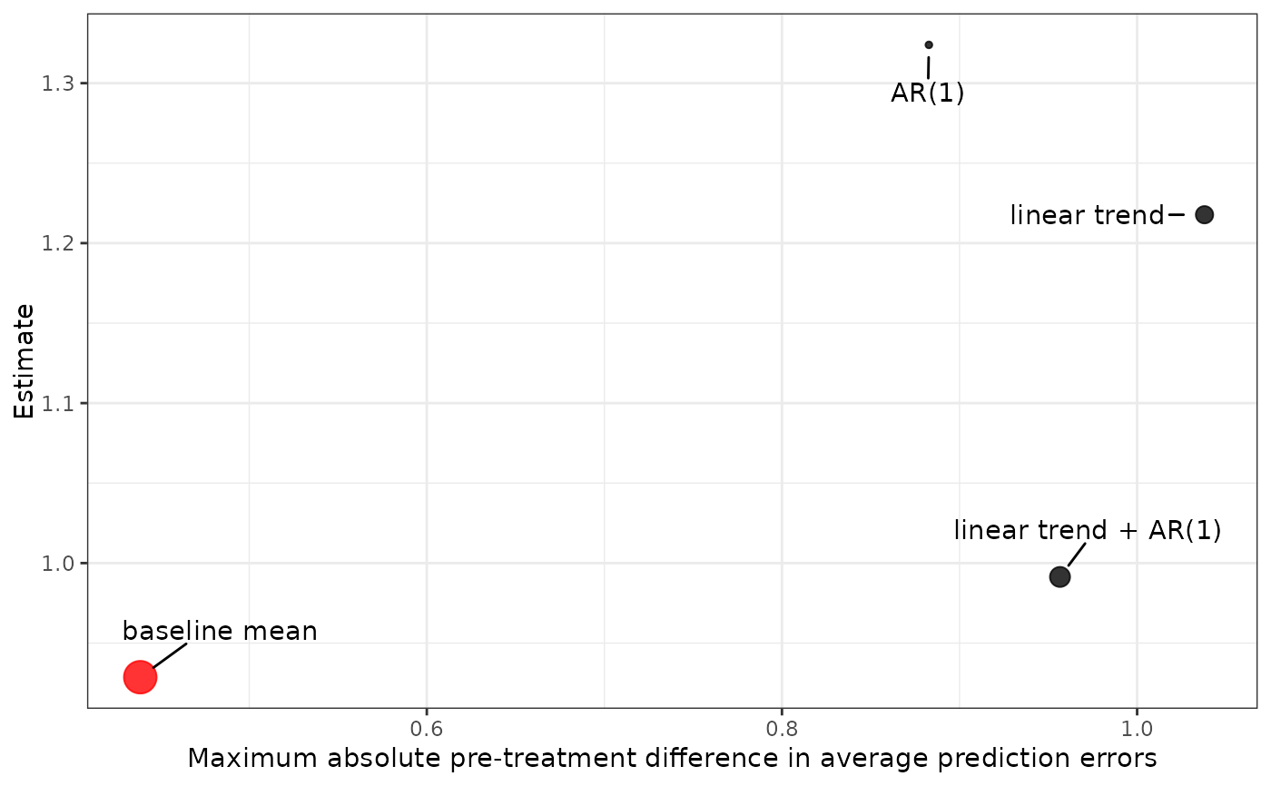 plot() returns a ggplot object displaying the ATT for each model plotted against the maximum absolute difference in average prediction errors for that model. The model with the lowest maximum absolute difference in average prediction errors is displayed in red.