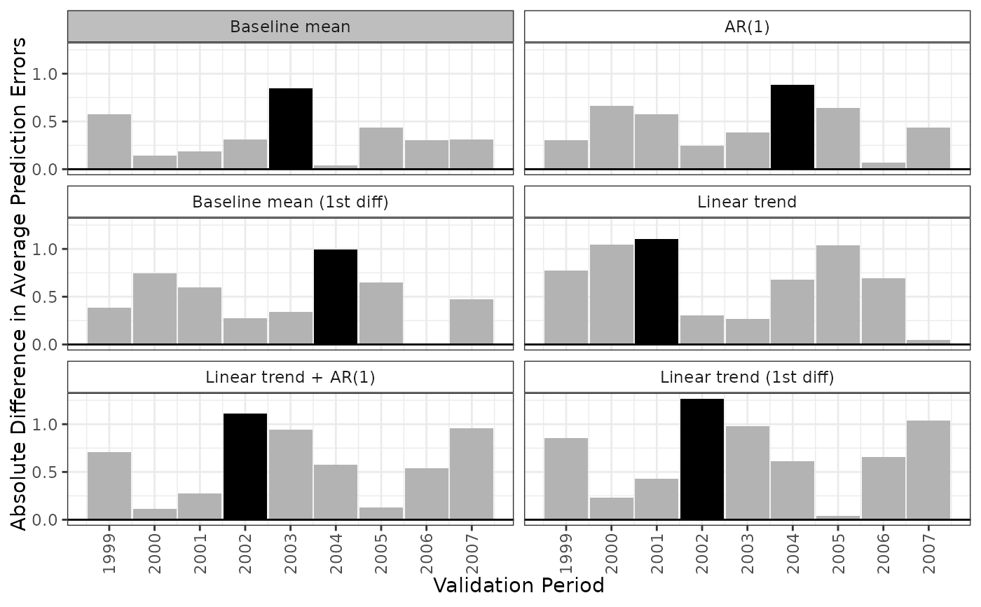When type = "errors", plot() displays a lattice of bar plots with a plot for each model displaying the difference in average prediction errors for each validation period. The period with the largest difference in average prediction errors will be shaded black. The model with the smallest maximum absolute difference in average prediction errors will have a gray label.
