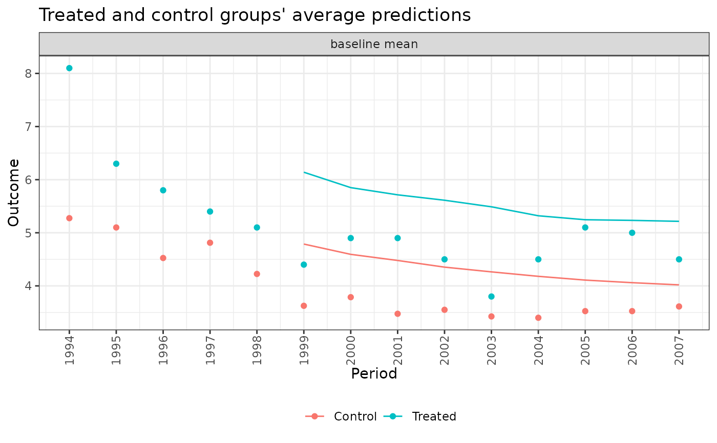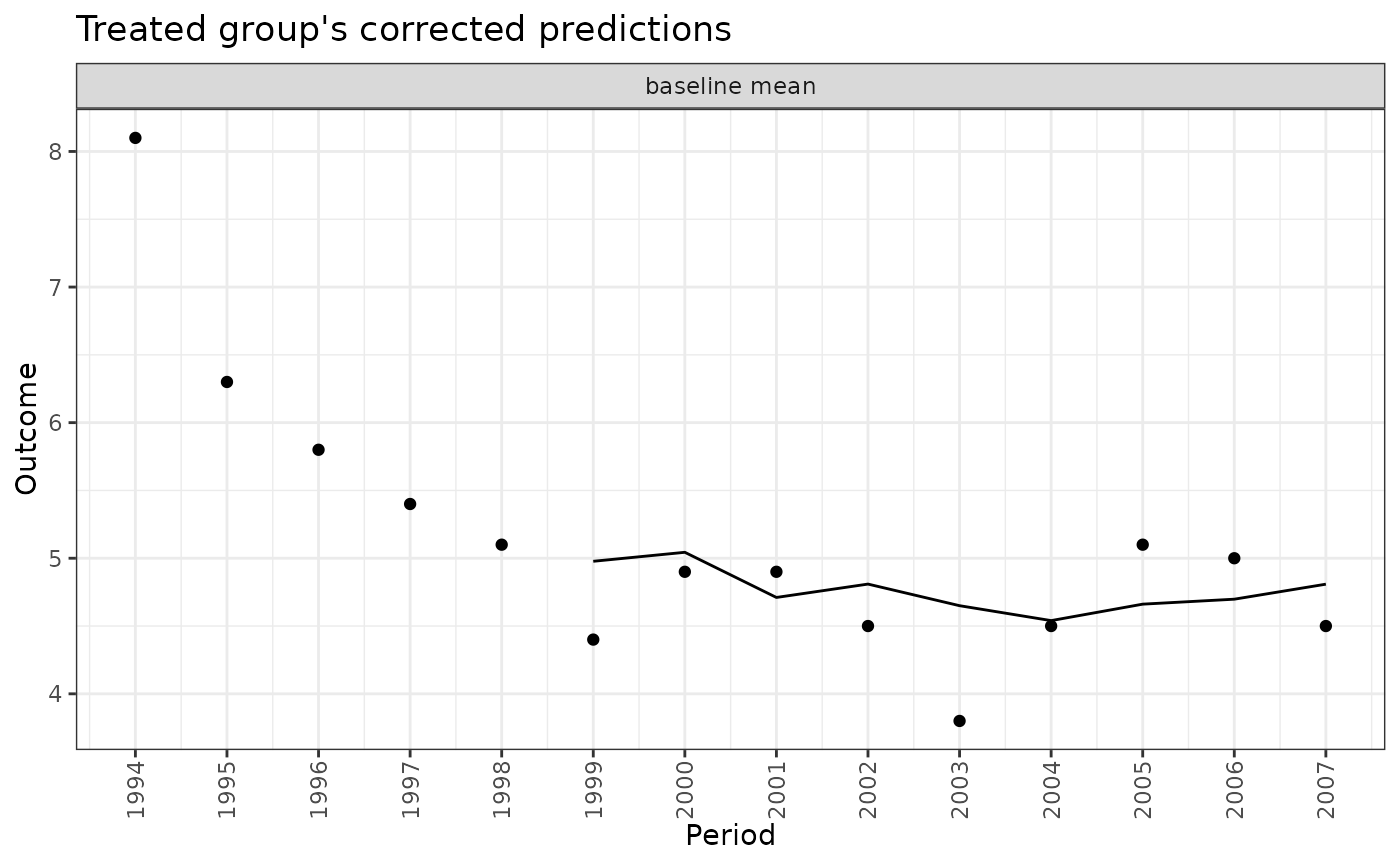 When type = "corrected", plot() displays a lattice of line plots with a plot for each model displaying the observed and corrected predictions for the treated group for each validation period under each model. The observed outcomes are displayed as points, while the corrected predictions are displayed as lines. Corrected predictions are computed as the observed outcome in the treated group minus the prediction error in the treated group plus the prediction error in the control group.